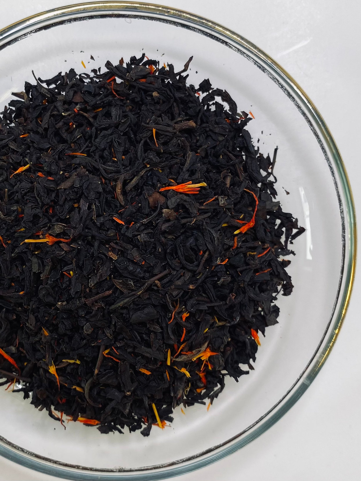Svart ekologiskt te (95%), russin, saffranstistel, arom.