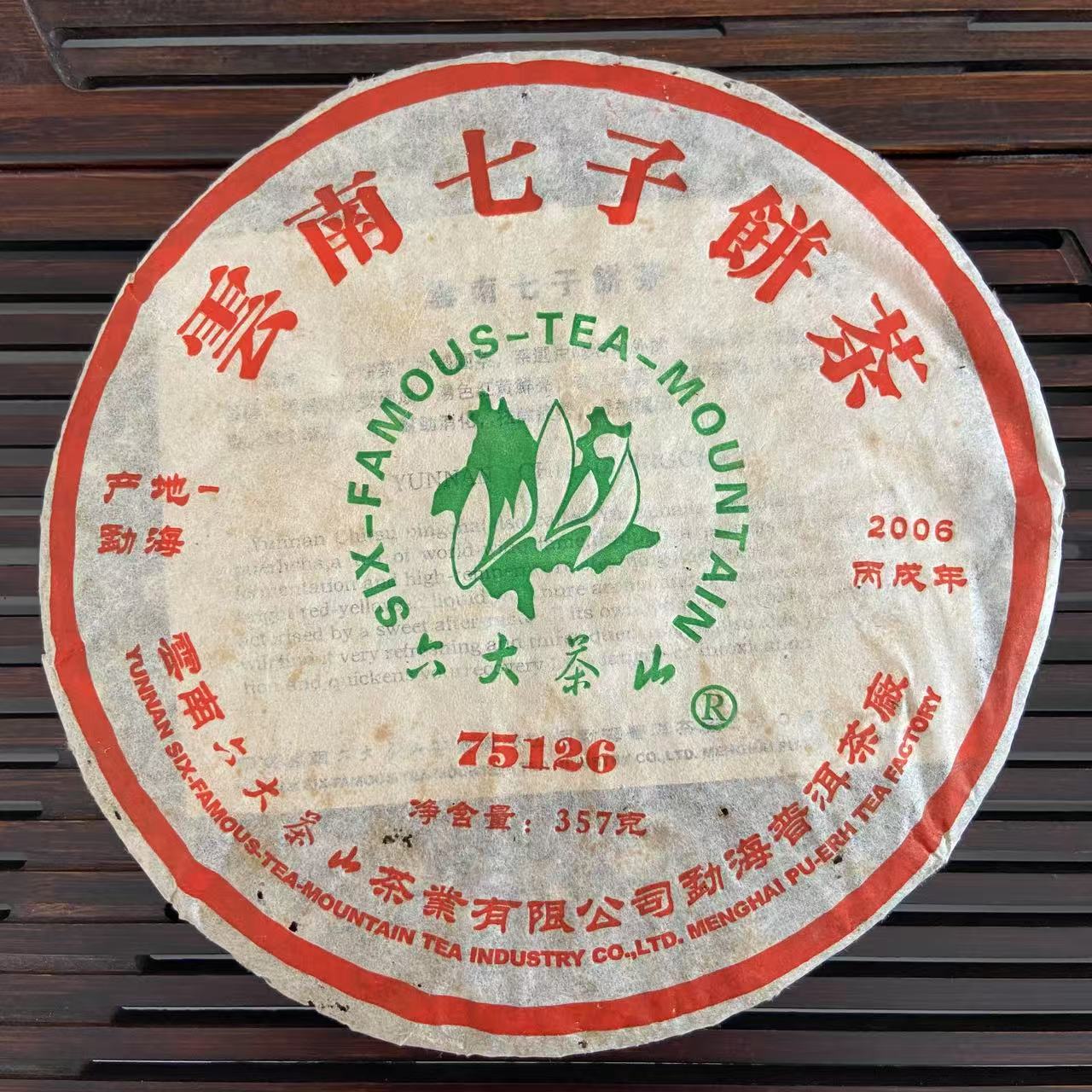 Upptäck en klassisk Pu-erh te från 2006 – "75126" från Liu Da Cha Shan (Six Famous Tea Mountains). Denna 357 grams råa (Sheng) puerh-kaka är inspirerad av det ikoniska 7512-receptet från Menghai Tea Factory och erbjuder en autentisk smakprofil från den berömda Menghai-regionen. Perfekt för både samlare och daglig njutning.