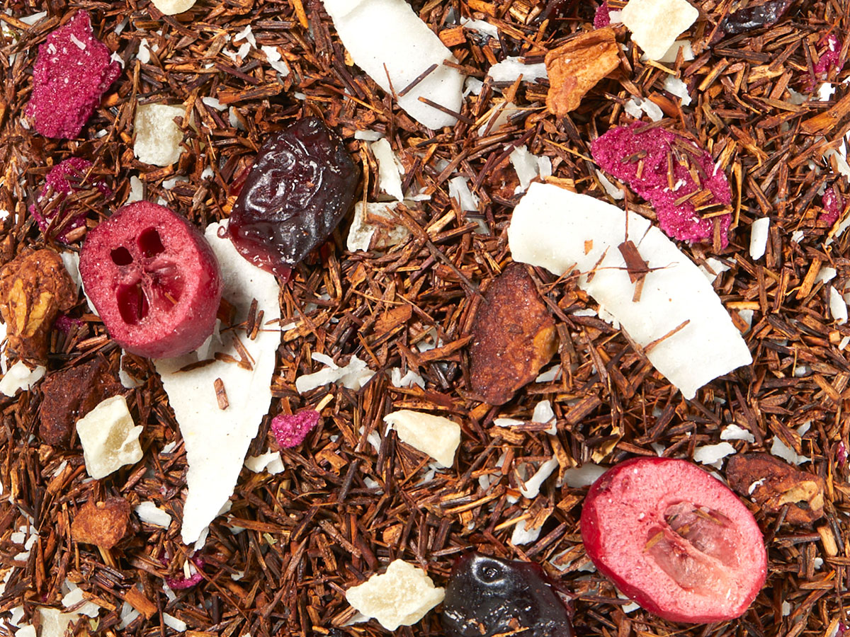 Denna lätta och dekorativa rooibos-teblandning glänser med kokoschips och riven kokos, tranbär, frystorkade bitar av drakfrukt och skivade tranbär. Syrliga äppelbitar lyfter den bärigt fruktiga smakprofilen, medan de mjukt krämiga kokostonerna rundar av blandningen till en perfekt helhet.